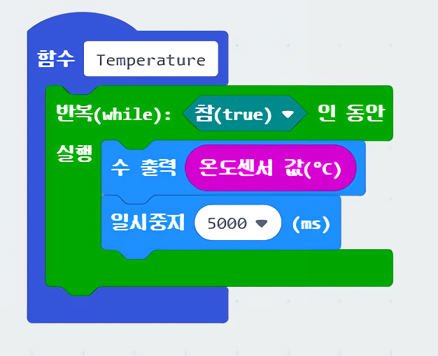 온도 센서 동작 함수를 만들어 보자. 온도 센서의 경우 비교적 간단하다. 기본 블록에 있는 온도 센서값 블록과 수 출력 블록을 이용해 온도 센서의 값을 LED에 표시해 준다. 이때 일시중지 블록 5000ms(5초)를 넣어 온도 값이 너무 자주 새로고침 되는 것을 방지한다.