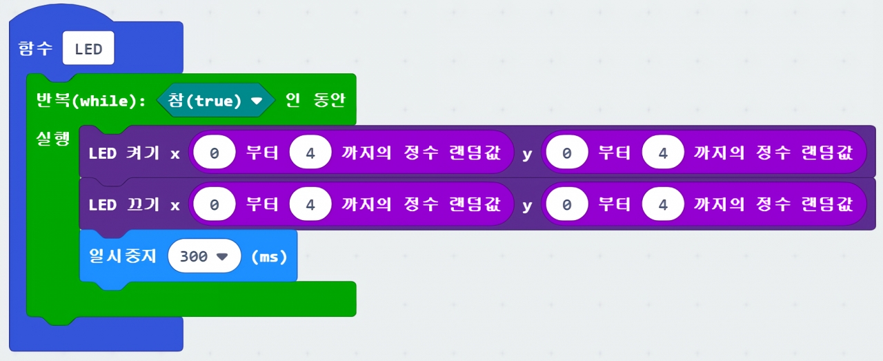 LED 동작 함수를 만들어 보자. 해당 LED는 25개의 LED 중에서 무작위한 자리의 LED를 켜고, 다시 무작위 자리의 LED를 끄는 동작을 하는 함수다. LED 켜기와 끄기 블록에 0부터 4까지 정수 무작위 값을 넣어 마이크로비트 LED의 좌표에 한 점씩 무작위 하게 켜졌다가 무작위한 좌표 LED에서 무작위 하게 꺼진다[그림4].