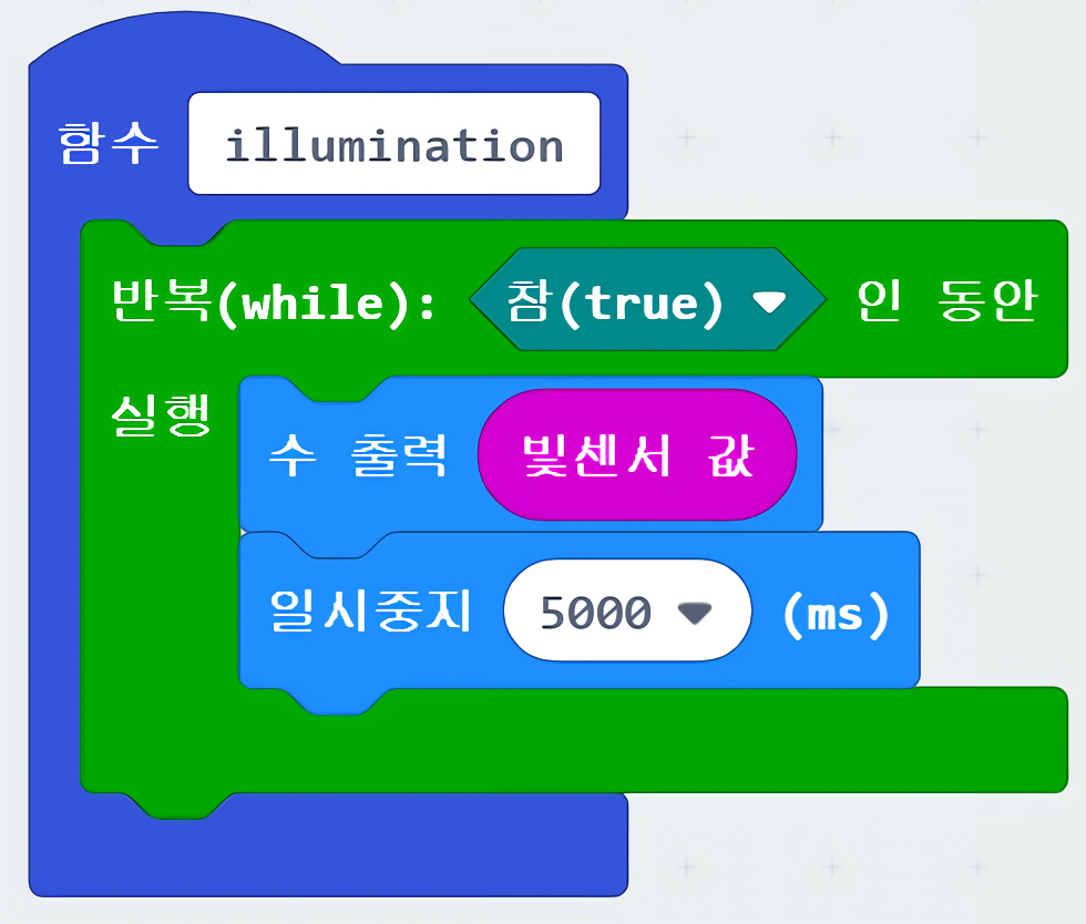 조도 센서 동작 함수를 만들어 보자. 조도센서의 경우도 간단하다. 기븐 블록에 있는 빛 센서값 블록과 수 출력 블록을 이용해 빛 센서값을 LED에 표시해 준다[그림6]. 이때 마찬가지로 일시중지 블록 5000ms(5초)를 넣어 조도 값이 너무 자주 새로고침 되는 것을 방지한다.