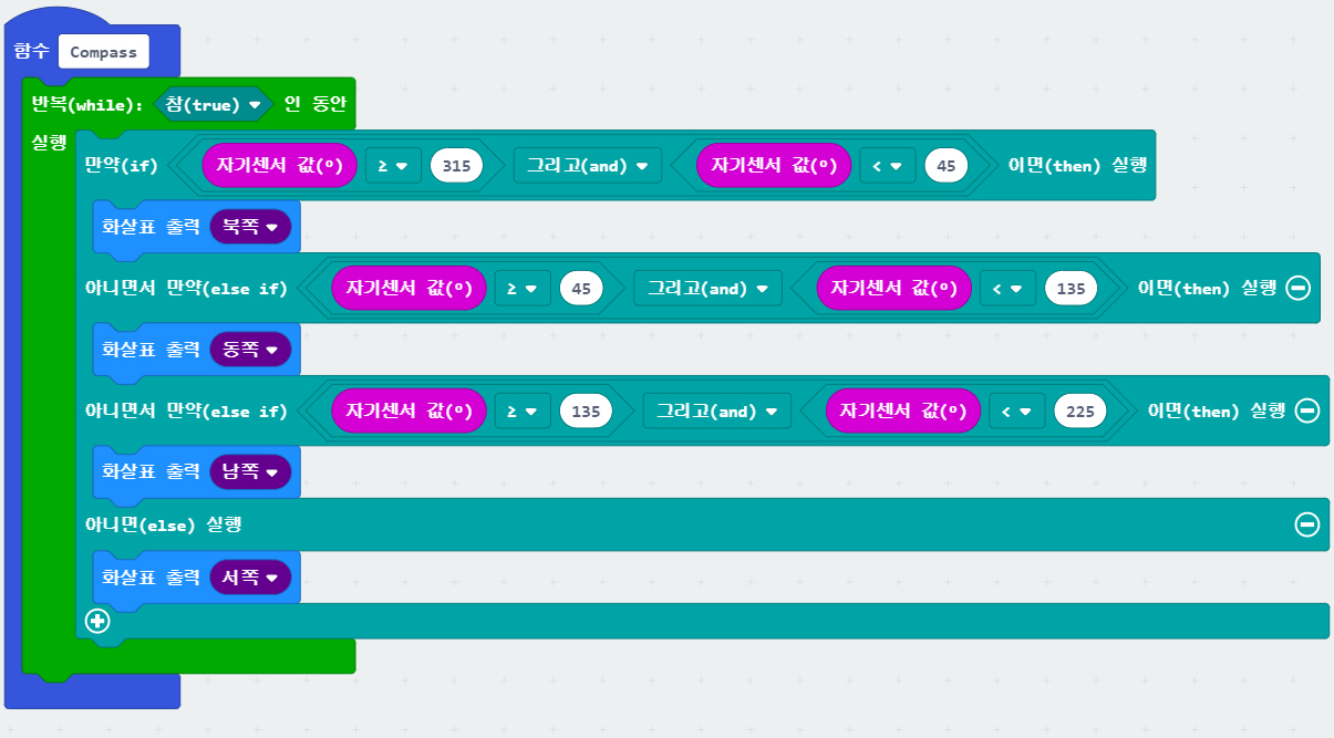 나침반 센서 동작 함수를 만들어 보자. 나침반 센서는 마이크로비트를 처음 켤 때 북쪽 방향을 한번 측정해 측정한 방향을 기준으로 마이크로비트의 위치에 따라 각도를 잴 수 있다. [그림7]의 코딩에서는 마이크로비트가 바라보는 방향의 각도에 따라 315도~45도 사이는 북쪽, 45도~135도는 동쪽, 135도~225도 사이는 남쪽, 225도~315도 사이는 서쪽으로 화살표를 가리킨다.