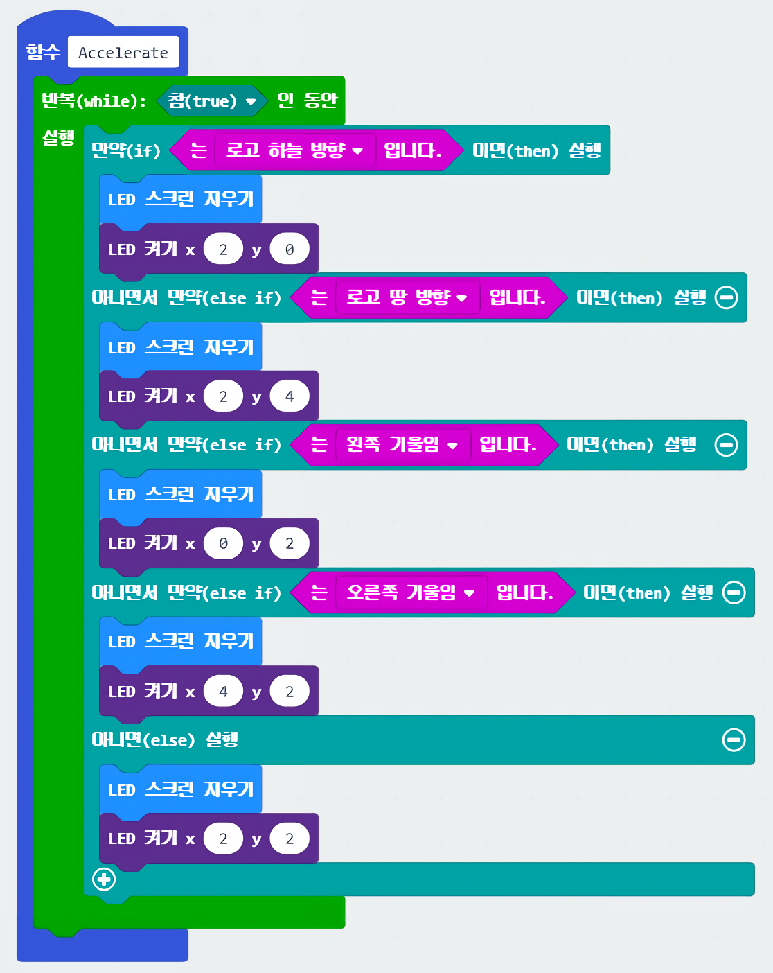 가속도 센서 동작 함수를 만들어보자. 가속도 센서는 마이크로비트를 중심으로 X축, Y축, Z축을 감지할 수 있는 센서다. 마이크로비트 심볼 로고에 따라 로고 하늘 방향, 땅 방향, 왼쪽 기울임, 오른쪽 기울임을 감지해 LED가 마치 중력에 이끌리듯 LED를 동작시키는 함수다[그림8].