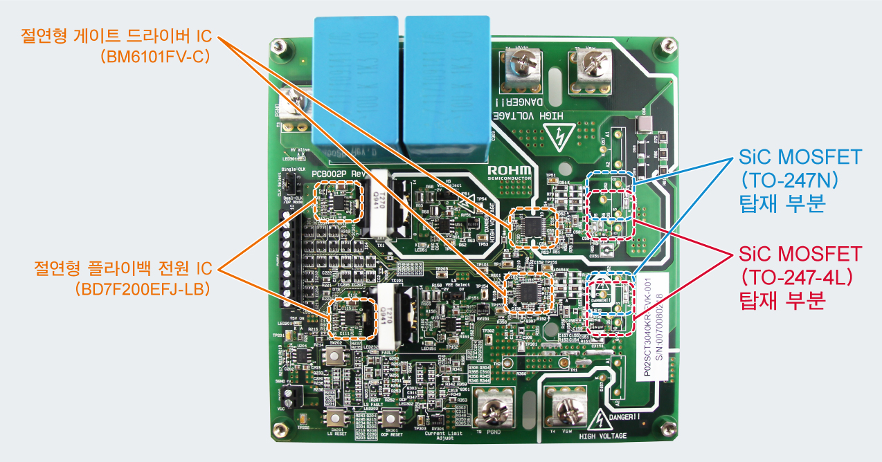 SiC 디바이스 구동에 적합한 로옴의 게이트 드라이버 IC(BM6101FV-C), 각종 전원 IC, 디스크리트 제품을 탑재한 SiC MOSFET 평가 보드 ‘P02SCT3040KR-EVK-001’를 함께 제공해, 디바이스를 간단히 평가할 수 있는 솔루션을 지원한다.