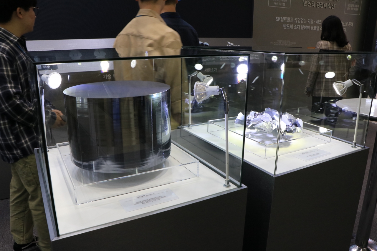 입구를 통해 전시장 안으로 들어서자마자 가장 먼저 반긴 업체는 SK실트론이었다. SK실트론은 실리콘 웨이퍼의 원재료인 실리콘 덩어리부터 잉곳 블록, 단계별 웨이퍼 등의 실물을 배치하고 웨이퍼의 제조공정을 한 눈에 살펴볼 수 있도록 했다.