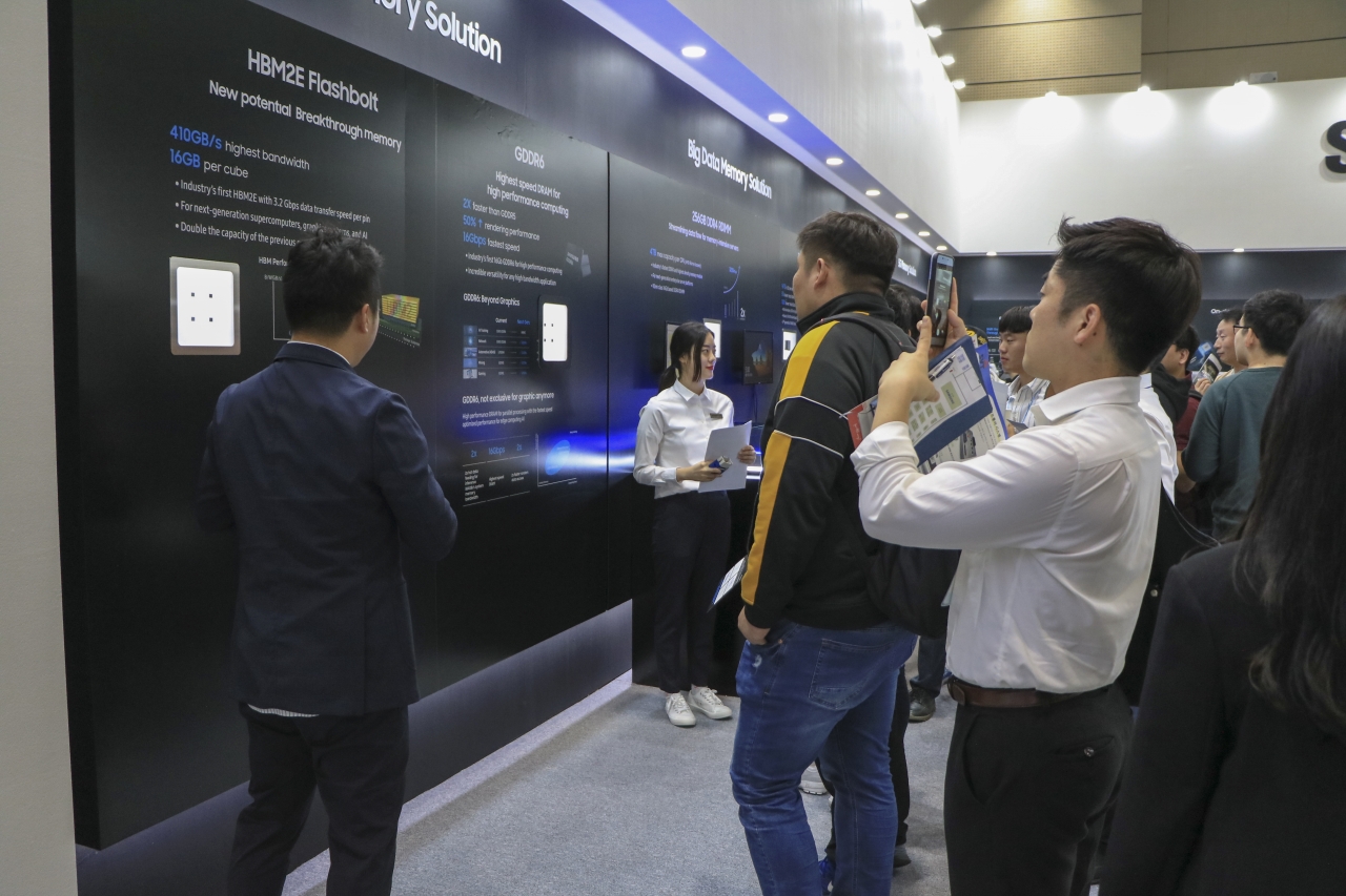 전시부스에서 참관객에게 주목받은 제품은 지난 6월 양산에 성공한 128단 4D 낸드였다. 이 반도체는 한 개의 칩에 3비트를 저장하는 낸드 셀 3600억 개 이상이 집적된 1테라비트 제품이다. 칩간 거리를 단축시켜 데이터 처리속도를 혁신적으로 향상시킨 ‘HBM2E’ D램도 전시했다. 이 제품은 이전 규격인 HBM2 대비 처리 속도를 50% 높였으며, 초당 460기가바이트의 데이터를 처리할 수 있다.