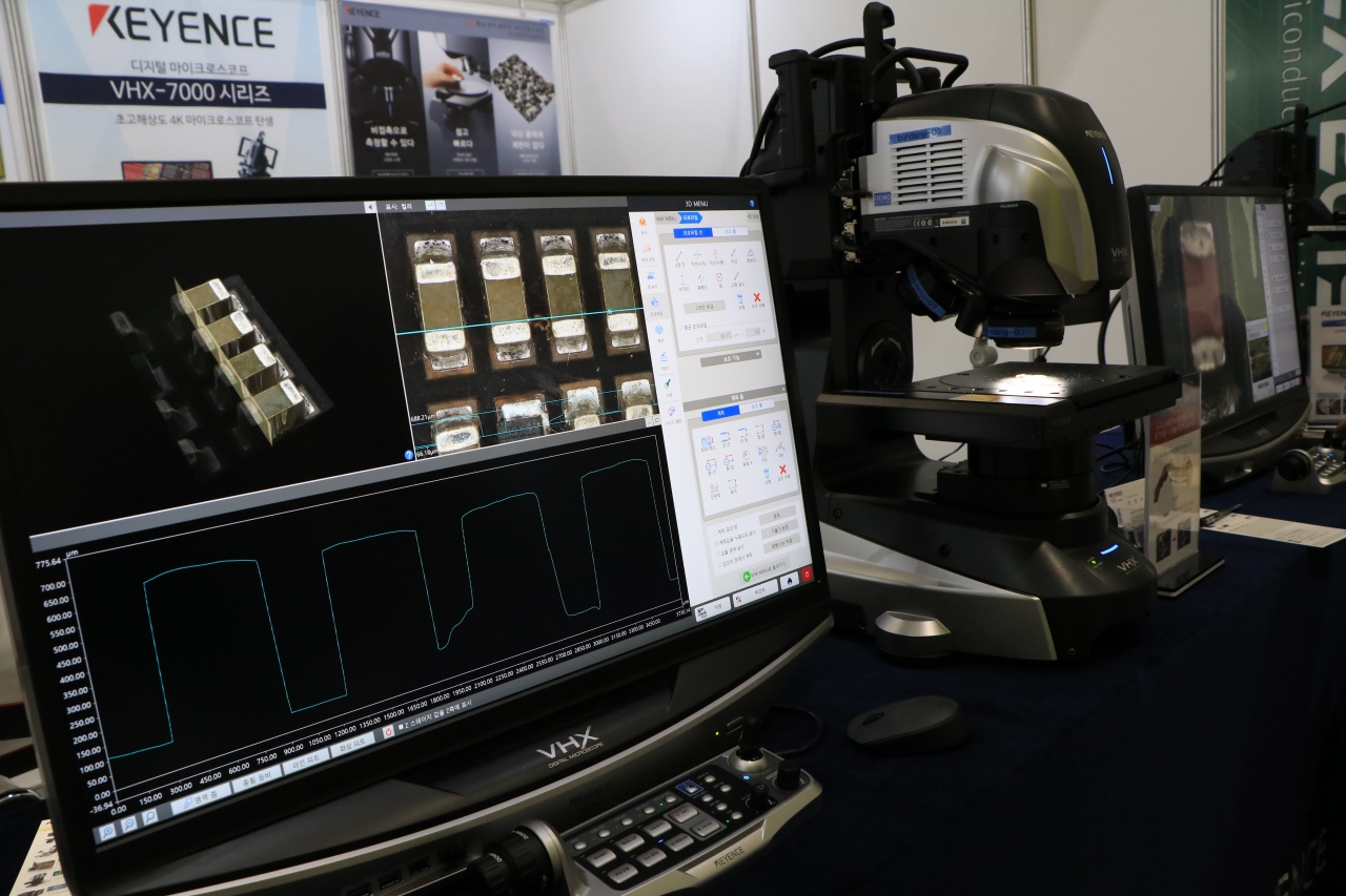 측정장비 업체로는 키엔스코리아가 눈에 띄었다. 이 업체가 선보인 초고해상도 4K 디지털 마이크로스코프 VHX-7000 시리즈는 현미경의 렌즈 하나로 반도체 칩의 3차원 이미지를 추출할 수 있는 제품이다. 원리는 의외로 간단하다. 렌즈가 바닥에서부터 꼭대기 면까지 자동으로 초점을 맞추면서 층층이 쌓아가며 이미지를 만들고 합성한다.