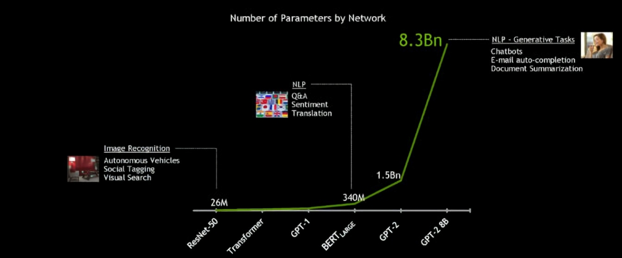 진정한 대화형 AI라는 꿈을 달성하기 위해 언어 모델들의 크기는 갈수록 커지고 있다. 또한 미래의 모델들은 현재 사용되는 모델보다도 크기가 더욱 커질 것이다. 이에, 엔비디아는 현존하는 트랜스포머 기반 AI 중 가장 큰 오픈소스 모델인 GPT-2 8B을 개발했다. GPT-2 8B은 버트-라지 대비 24배나 크고, 83억 개의 매개변수를 제공하는 언어처리 모델이다.
