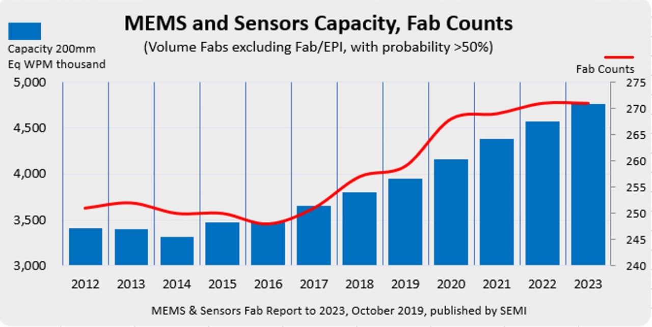 2018년부터 2023년까지 매년 약 40억 달러의 팹 장비 투자가 진행될 것으로 예상되며, 투자의 약 70%는 300mm 웨이퍼 기반 이미지 센서 팹에 이뤄질 것으로 보인다. 같은 기간 동안 일본 내 팹 장비 투자는 2020년에 약 20억 달러, 대만은 2023년에 약 16억 달러에 달할 것으로 전망된다. 200mm와 300mm 웨이퍼 기반 MEMS와 센서를 생산하는 팹은 2018년부터 2023년까지 14개가 추가될 것으로 전망되며, 이는 중국 내에서 가장 많이 건설될 것으로 예상된다.