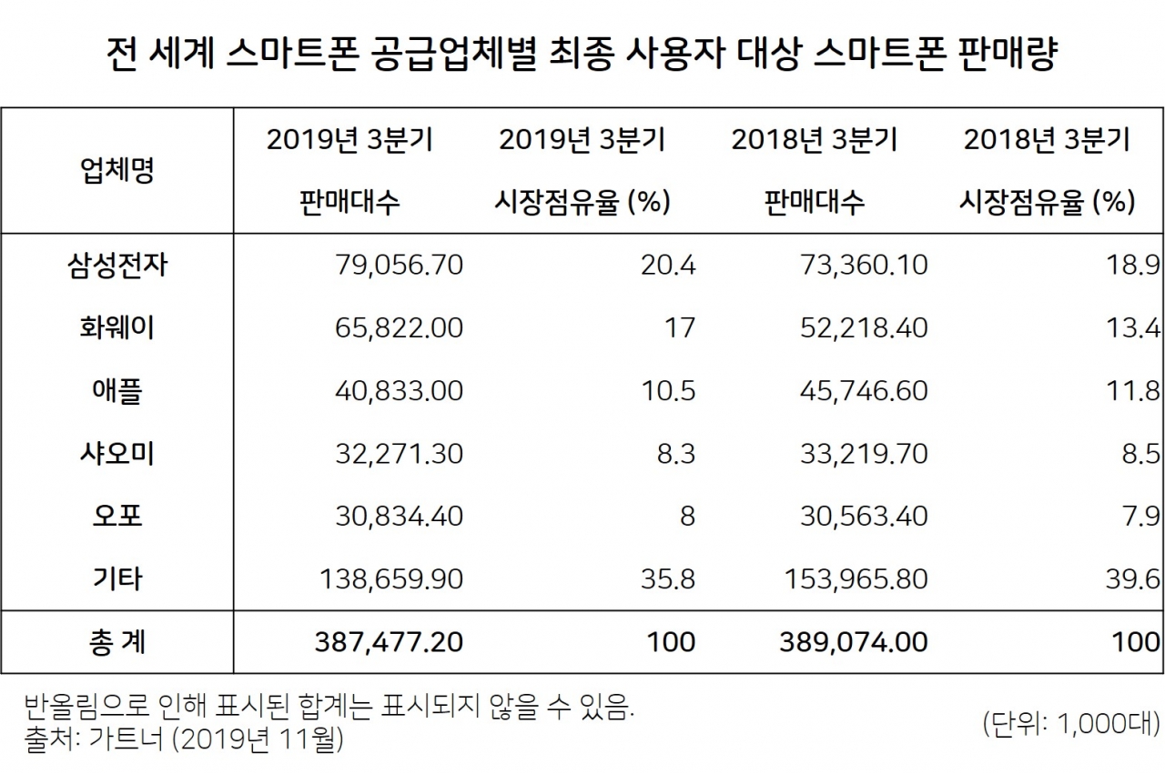 반면, 애플은 전년 동기 대비 10.7% 감소하면서 여전한 하락세를 보이고 있다. 안슐 굽타 책임연구원은 “애플의 프로모션과 할인 전략은 개선되고 있으나, 전 세계의 수요를 자극하기엔 부족했다. 하반기 발표한 아이폰 11, 아이폰 11 프로, 아이폰 11 프로 맥스가 초기에 좋은 실적을 보여줌에 따라, 4분기에 긍정적인 성과를 보일 것”이라고 예측했다.