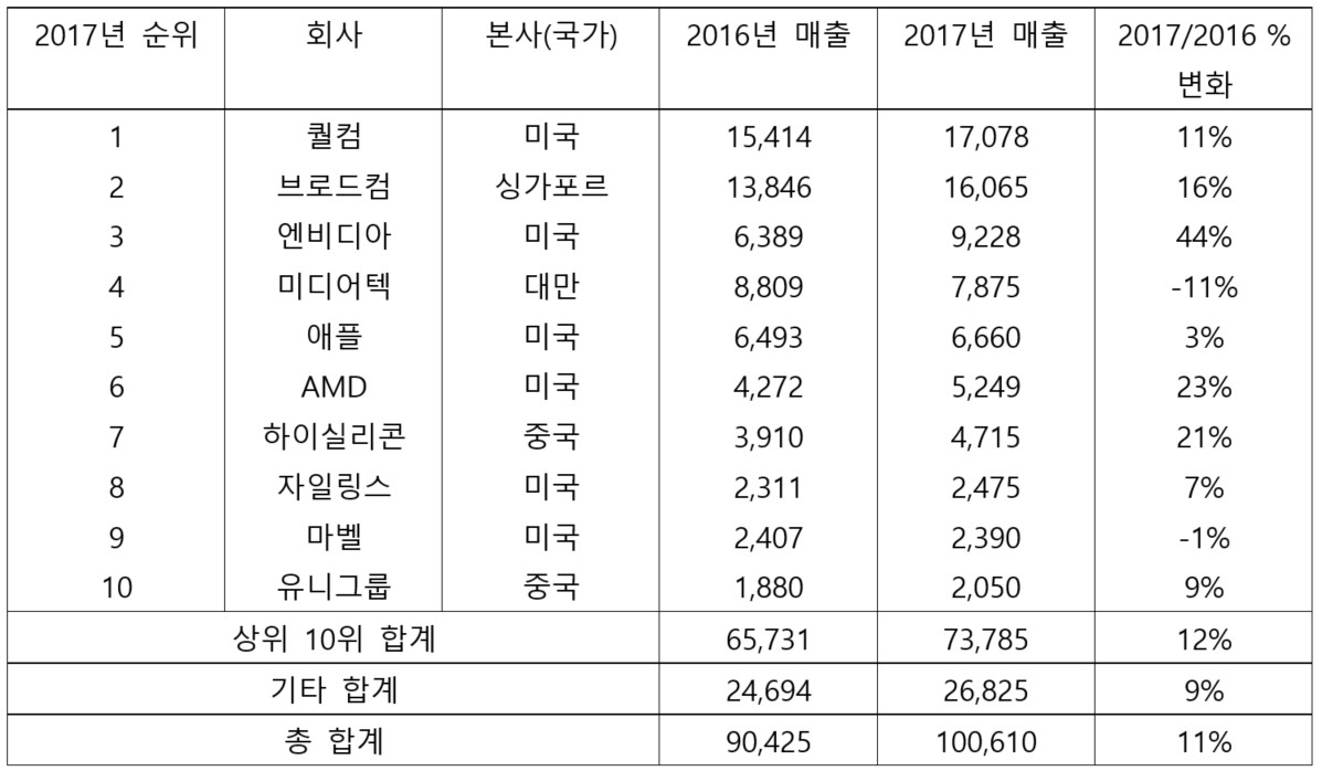 여기서 세계 팹리스 10위권 업체 중 2위 업체인 브로드컴이 싱가포르에 속한다는 점을 주목할 필요가 있다. 브로드컴은 지난 2016년 싱가포르의 아바고 테크놀로지가 41조 원에 인수했다. 그 다음해인 2017년 11월에는 브로드컴이 퀄컴을 인수하려 했으나 불발됐다. 그 이유는 미국 트럼프 대통령이 국가 안보 위협을 이유로 인수합병을 불허했기 때문이다. 미국 정치권에서도 중국 화웨이와의 특수 관계 가능성을 우려했다. 그래서인지 브로드컴은 싱가포르와 미국 두 곳에 있던 본사를 2018년 4월 미국으로 통합 이전했다.