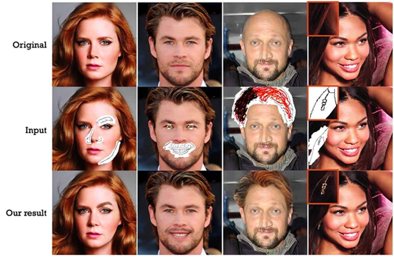연구진이 공개하는 또 하나의 핵심 기술은 전문 편집 프로그램 없이도 사람의 얼굴 사진을 쉽고 자연스럽게 편집할 수 있는 기술(SC-FEGAN)이다. 이 기술로는 사진 속 인물이 하고 있지 않던 액세서리를 추가하거나 머리 모양, 표정까지도 바꿀 수 있다. 심지어 낙서 등으로 인해 일부가 훼손되거나 빈 공간이 생겨도 원하는 내용을 간단하게 그려 복원할 수도 있다.