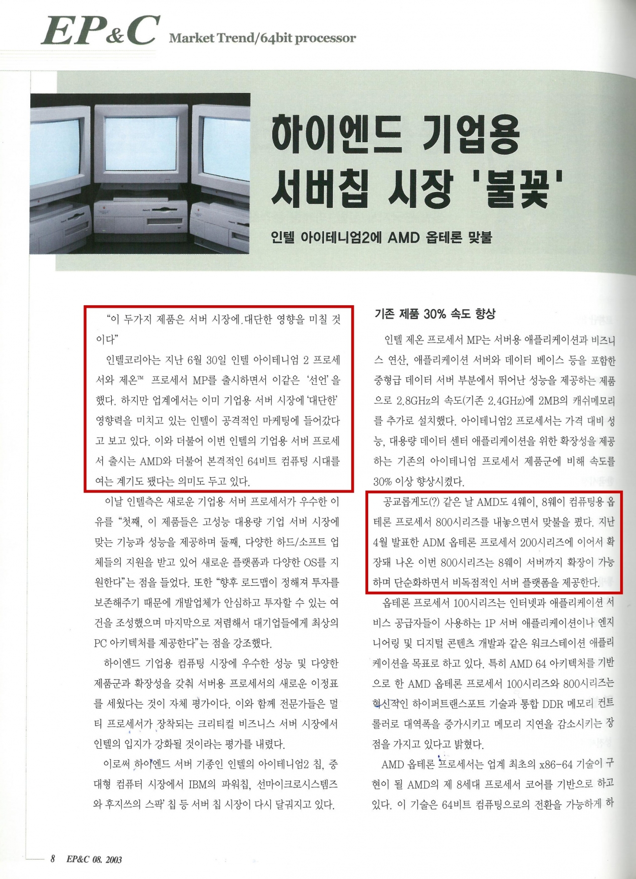 인텔코리아는 지난 6월 30일 인텔 아이테니엄2 프로세서와 제온 프로세서 MP를 출시하면서 이같은 ‘선언’을 했다. 하지만 업계에서는 이미 기업용 서버시장에 ‘대단한’ 영향력을 미치고 있는 인텔이 공격적인 마케팅에 들어갔다고 보고 있다. 이와 더불어 이번 인텔의 기업용 서버 프로세서 출시는 AMD와 더불어 본격적인 64비트 컴퓨팅 시대를 여는 계기도 됐다는 의미도 두고 있다.
