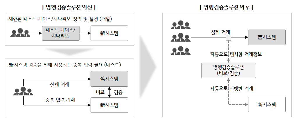 올해 9월 오픈한 교보생명, NH농협카드, KB국민카드 등 금융권 차세대 프로젝트에 적용해 새로운 시스템 안정화에 기여하기도 했다. 특히 NH농협카드의 경우 기존의 테스트 방법으로는 검증이 불가능했던 1억 건의 실제 승인 거래를 3개월만에 모두 검증하는 데 성공했다. 이와 함께 오픈 3개월 전 93% 수준이었던 승인거래 성공률을 한 달 만에 100%에 육박하는 수준으로 끌어올렸다.