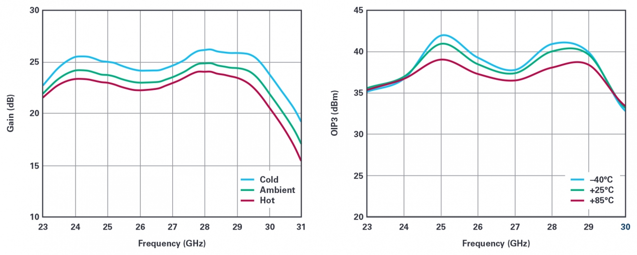HMC863ALC4는 28GHz 5G 통신 인프라용으로 적합한 전력 증폭기(PA, Power Amplifier) 제품으로, 24~29.5GHz를 지원하며 0.5W 이상의 RF 전력을 제공한다. 이는 소형 4×4mm 표면실장 패키지로 제공되며, 40dBm에 가까운 TOI(Third-order Intercept)를 특징으로 한다. [그림 3]은 이 제품의 성능을 보여준다.
