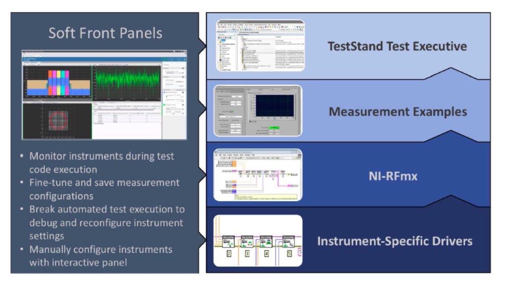 [그림 3]에 소개된 소프트웨어 정의 ‘소프트 패널’은 전체 솔루션 제어와 작업 일정 설정에 사용될 뿐만 아니라, 개별 모듈 제어용으로 쉽게 생성·설정할 수 있다. NI-RFmx 라이브러리는 인접 채널 전력(ACP, Adjacent Channel Power) 분석과 같이 특성화와 테스트 시퀀스에 포함할 수 있는 다양한 측정 루틴의 소스를 제공한다. 이 라이브러리는 FSK(Frequency Shift Keying), PSK(Phase Shift Keying), QAM(Quadrature Amplitude Modulation) 신호 등 복잡한 웨이브폼을 생성할 수 있는 웨이브폼 생성기도 포함한다.