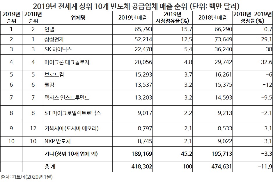 가트너의 자료에 의하면, 인텔은 작년 총 매출액 657억 9300만 달러를 기록하며 지난 2년간 매출 측에서 삼성전자에게 내줬던 글로벌 1위를 탈환했다. 서버 시장의 침체, CPU 공급 문제 등으로 메모리 반도체 시장의 불황 타격을 벗어나긴 힘들었으나, 4분기 셀룰러 모뎀 사업을 애플에 판매하는 등 여러 요인으로 연간 하락폭이 비교적 낮았다.