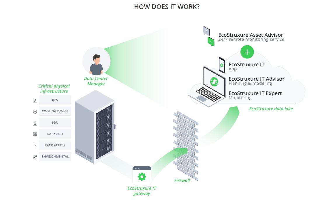 슈나이더일렉트릭의 데이터센터를 위한 ‘에코스트럭처 IT’는 전체 서비스가 클라우드 기반으로도 제공되기 때문에 ‘어셋 어드바이저’ 솔루션과 긴밀히 결합이 가능하다. 고객의 인프라 운영 관련 데이터가 게이트웨이를 통해 수집되고 필요한 데이터를 클라우드로 보내면 ‘에코스트럭처 IT’가 다양한 분석 서비스를 제공, 사용자가 필요한 서비스에 접근, 활용할 수 있다.