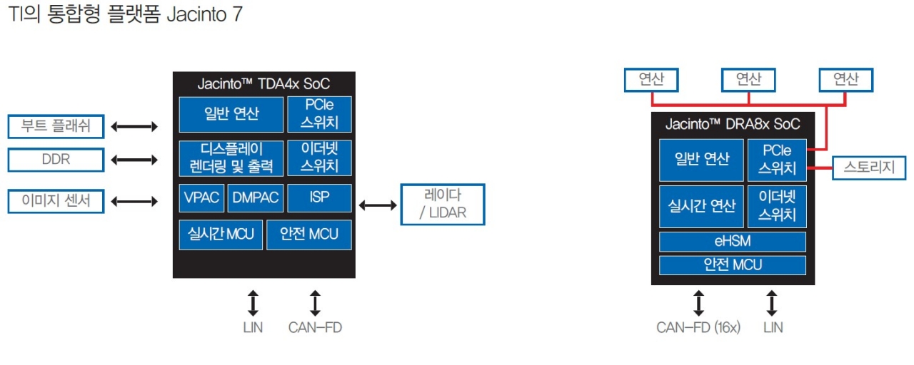 텍사스 인스트루먼트(Texas Instruments, 이하 TI)는 1월 16일 기자간담회를 열고 차량용 플랫폼 장치로 ADAS용 TDA4VM 프로세서와 게이트웨이용 DRA829V 프로세서를 통합한 플랫폼 자신토 7(Jacinto 7)을 공개했다. TI는 이번 프로세서에 처음으로 딥러닝 기술을 도입했다. 또한, 5~20W의 전력만으로도 고성능의 ADAS(Advanced Driver Assistant System)를 실행할 수 있어 냉각 장치를 필요로 하지 않는다.