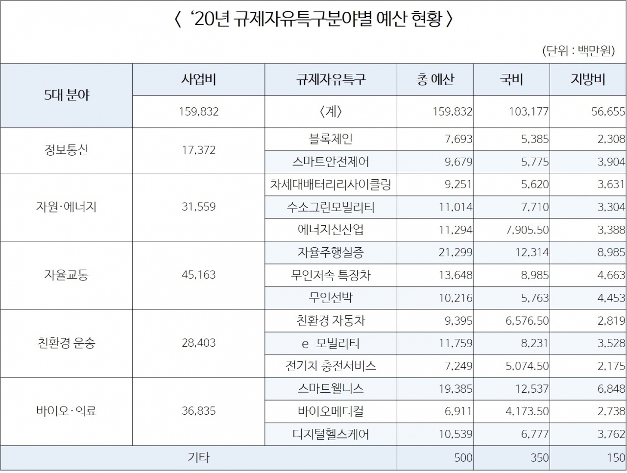 중기부와 지자체는 지난해 7월, 11월 총 2차에 걸쳐 규제자유특구와 기술 분야를 지정했고, 추진 체계를 구축하고 기업을 이전하는 등 현정 점검을 마루리하고 본격 실증에 착수한다. 예산이 투입되는 신기술·신사업 5대 분야는 ▲정보통신(174억 원) ▲자원·에너지(316억 원) ▲자율교통(452억 원) ▲친환경 운송(284억 원) ▲바이오·의료(368억 원)다.
