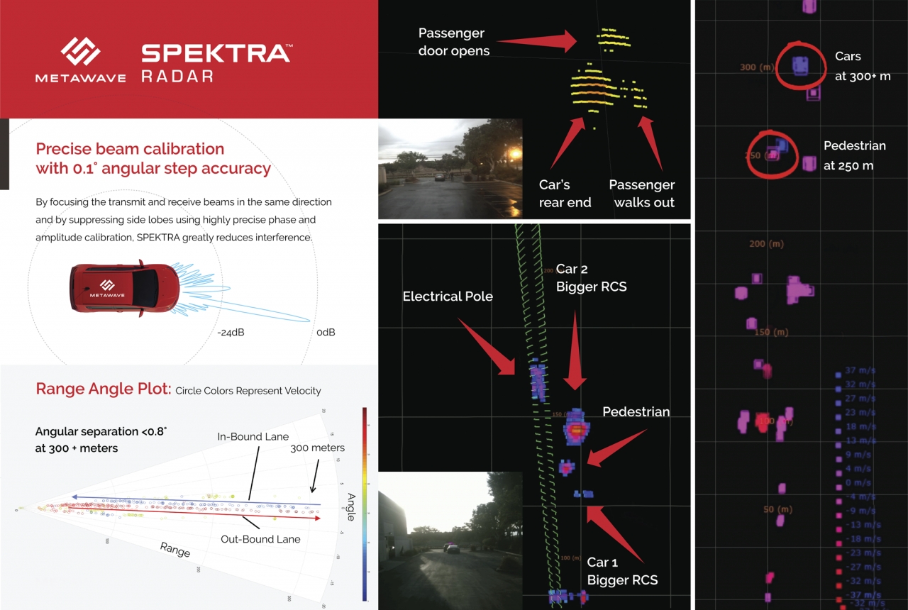 스펙트라는 300m 이상 떨어진 차량과 200m 이상 거리의 보행자를 최상의 각도 분해능으로 명확히 감지할 수 있다. 메타웨이브는 현재까지 150개 이상의 특허를 출원했으며 2019년 특허를 발급받았다. 메타웨이브가 ‘CES 2020’에서 실시한 스펙트라 레이더 시연(Metawave’s SPEKTRA radar demonstration from CES 2020)은 회사 유튜브 채널이나 메타웨이브 홈페이지에서 확인할 수 있다.