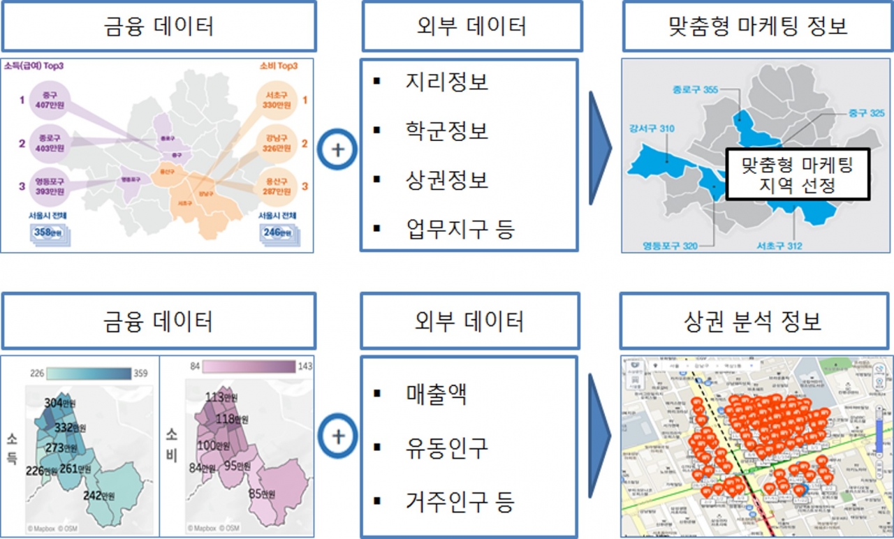 실제로 미국의 비자(VISA)는 고객의 소비 정보, SNS 정보, 위치 정보 등을 활용해 맞춤형 제휴사 할인 프로모션을 제공하고, 개인신용조회회사(CB, Credit Bureau)인 익스피리언(Experian)은 수집한 신용정보를 바탕으로 연령·거주지별 소비자의 특성과 소비여력을 제공하는 등의 다양한 컨설팅 서비스를 제공하고 있다.