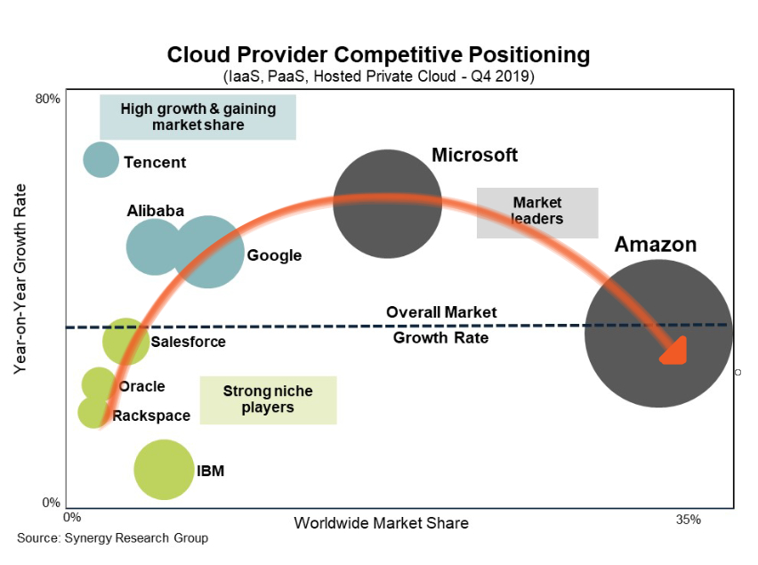 시너지리서치그룹의 보고서에 따르면, 클라우드 시장은 선두를 달리고 있는 5개 업체들이 이끌어가고 있었다. 특히, 부동의 시장점유율 1, 2위를 달리고 있는 아마존과 마이크로소프트가 시장에 미치는 영향력이 막대했다. 그에 반해, 니치 플레이어(Niche Player, 틈새시장을 노리고 있는 기업)들은 전반적으로 낮은 성장률을 보이고 있었으며, 시장도 적은 비율로 점유하고 있어, 한계에 다다른 것으로 드러났다.
