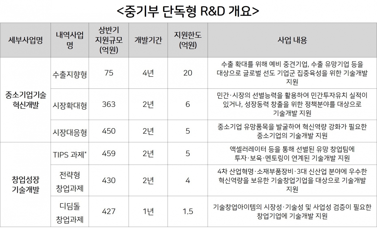 창업성장 기술개발사업은 창업 7년 이하, 직전년도 매출액 20억 원 미만 업체가 대상이며, 기술혁신개발사업은 매출액 20억 원 이상의 기업을 대상으로 진행한다. 이 두 사업은 기업 주관의 단독형 지원사업이다. 수행 과제는 기존과 동일하게 최대 2개, 단독형 R&D는 최대 1개만 수행할 수 있다.