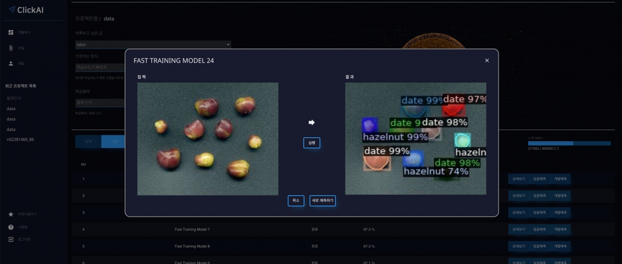 CLICK AI는 데이터 과학자나 통계적 지식이 없어도 클릭만으로 딥러닝 기반 AI를 만들 수 있는 AI 개발 자동화 솔루션이다. AI를 학습할 데이터를 업로드한 후 클릭 몇 번만으로 최대 100여 개의 딥러닝 기반 AI를 학습하고 생성된 모델을 정확도 순으로 출력한다.