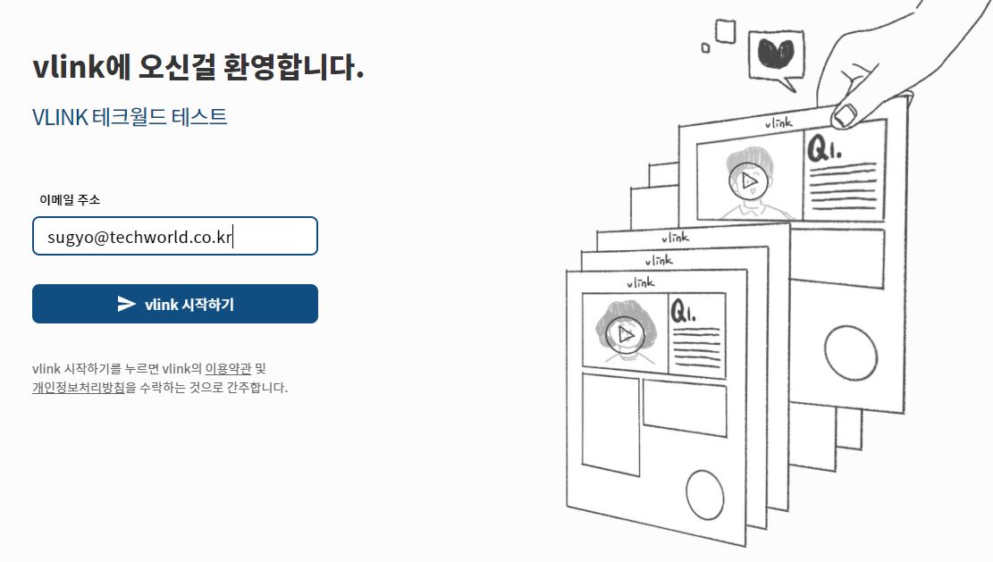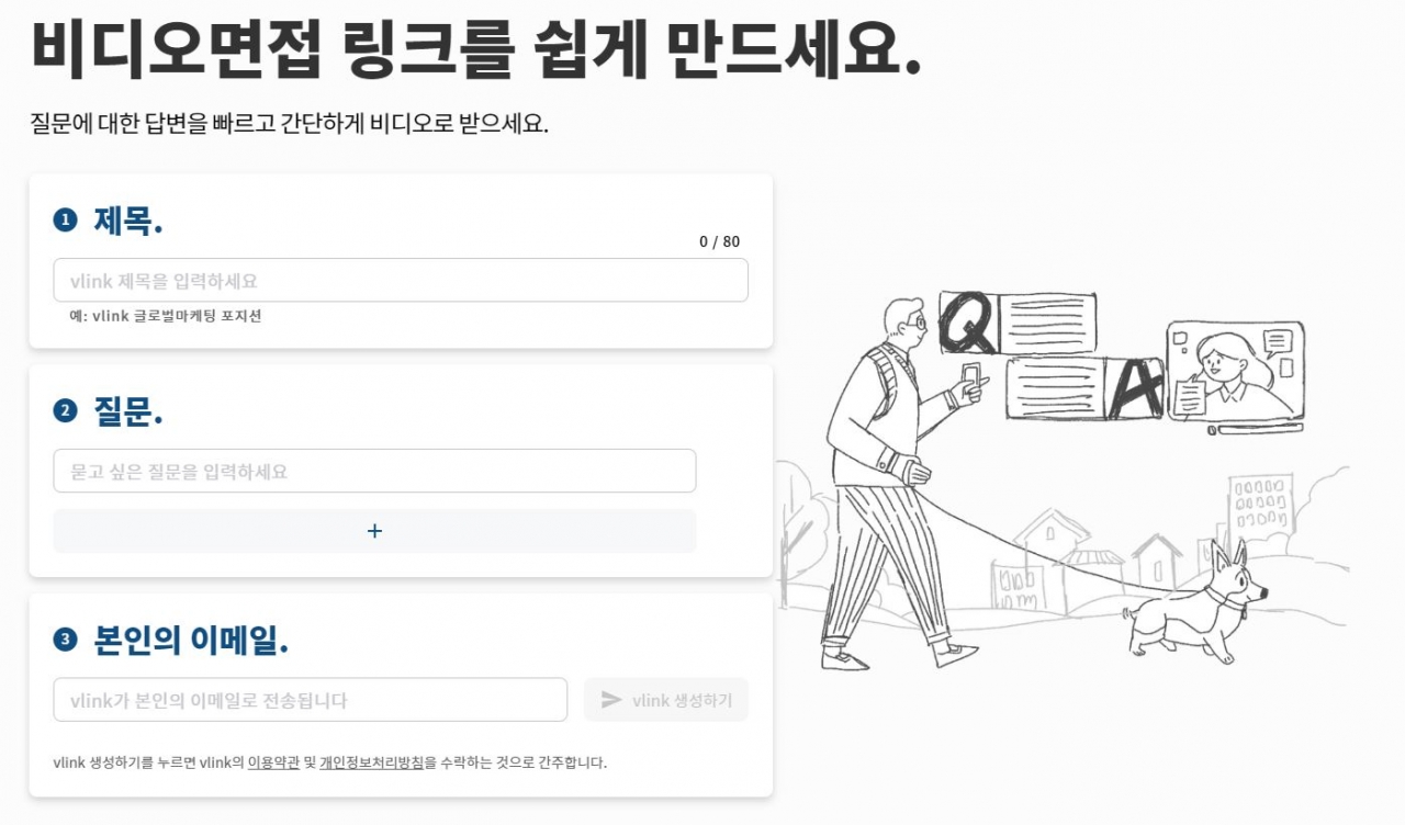 vlink를 활용하기 위해 먼저 www.vlink.ai에 접속해보자. 곧바로 질문지를 작성할 수 있는 화면이 뜬다. 여기에 제목과 필요한 질문들을 입력하면 된다. (질문은 아직 5개로 제한돼 있다) 다음으로 답변받을 자신의 이메일 주소를 입력한 뒤 'vlink 생성하기' 버튼을 누른다.