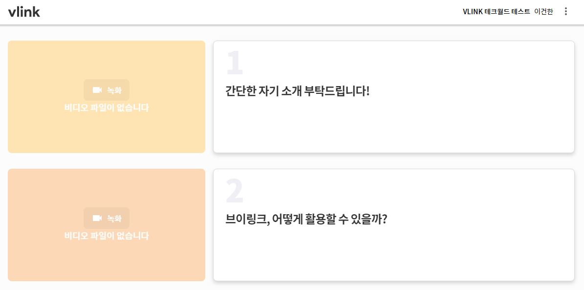 질문지에 접속 후 각 질문별로 녹화를 진행한다. 현재 질문당 최대 5분까지 녹화할 수 있다. 녹화 후 다음-업로드를 누르면 응답 영상이 저장되며 재녹화가 가능하다. 이어 모든 질문에 대한 녹화가 끝나면 하단에 ‘vlink 보내기’ 버튼이 활성화되고, 이를 누르면 인사 담당자에게 자신의 응답 내용이 전송된다.