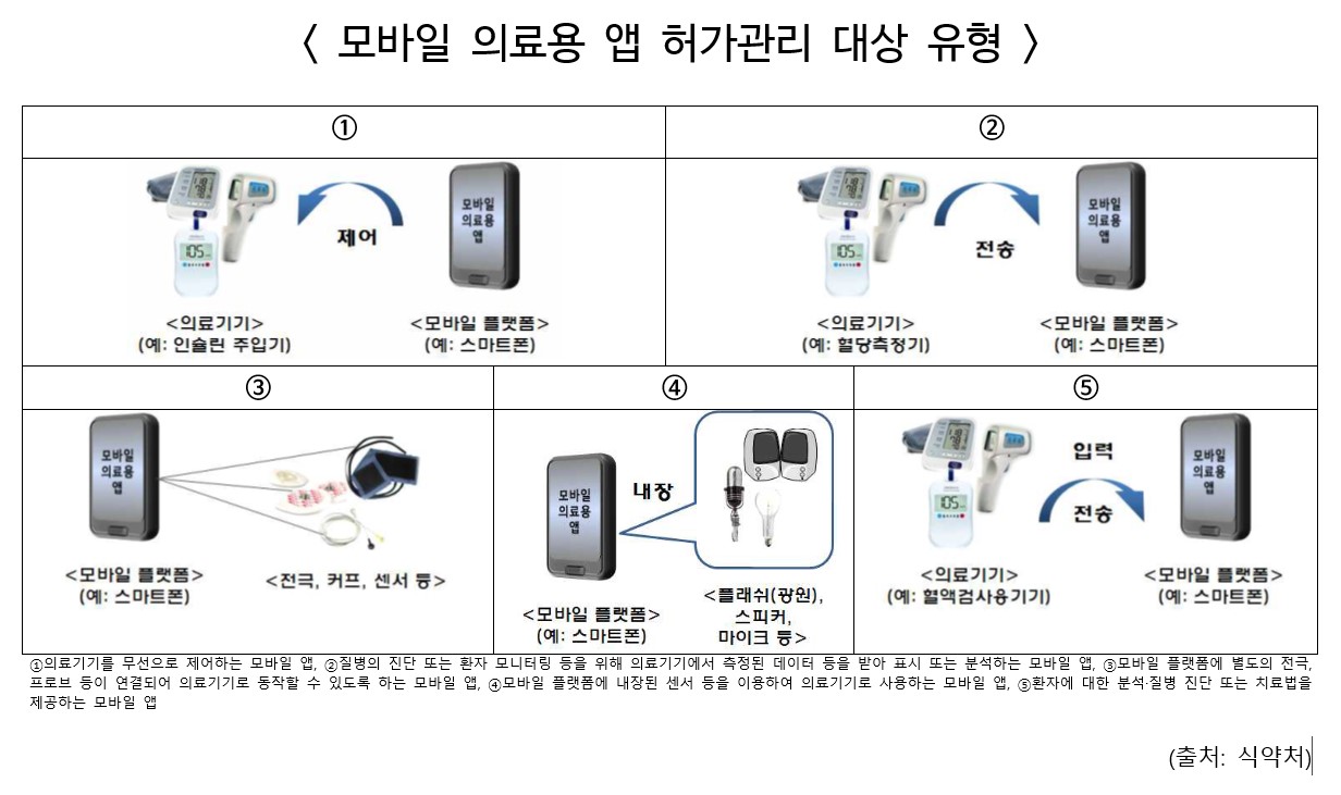 이번 지침 개정을 통해 모바일 의료용 앱이 의료기기로 허가를 받게 되면, 스마트 기기에서 앱과 연동되는 모바일 플랫폼은 따로 허가를 받지 않아도 된다. 모바일 의료용 앱 허가관리 대상은 아래의 5가지 유형으로 분류된다.