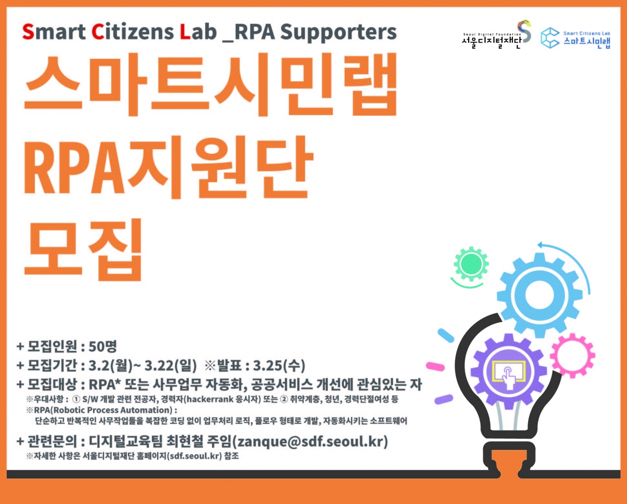 [테크월드=배유미 기자] 서울디지털재단(이하 재단)이 22일까지 공공부문 RPA(Robotic Process Automation, 로봇업무자동화) 도입을 지원하는 ‘스마트시민랩 RPA 지원단’을 50명 모집한다.