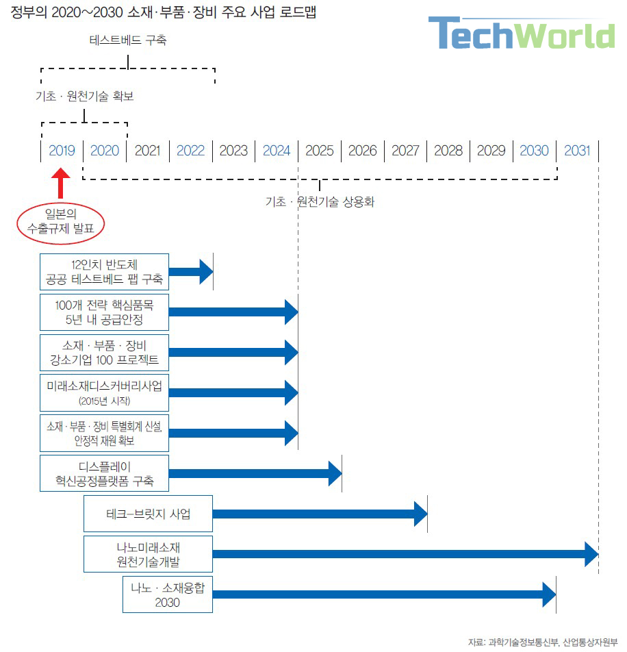 이는 고급 공정에 사용되는 해외 소재·장비·부품을 대체하기 위해서는 국내의 기술력이 많이 부족해, 단기적으로는 2024년까지, 길게는 2030년까지 관련 원천기술을 확립하겠다는 분석이다.