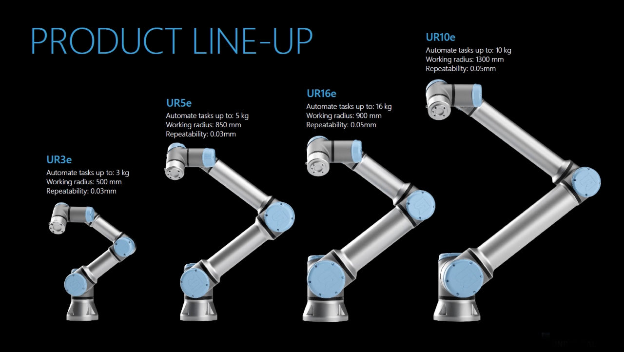 제품 포트폴리오는 협업 UR3, UR5, UR10, UR16 (UR3, UR5, UR10 & UR3e, UR5e, UR10e, UR16e 시리즈가 있다. 여기서 각 숫자는 로봇 암이 수용할 수 있는 kg을 뜻한다. 스탠다드 타입와 e 타입이 있으며, e 타입은 ISO 안전 표준 준수, 정확도와 민감도 향상, 유지보수의 편리성 강화 등 기존 1세대인 스탠다드 타입보다 한 단계 업그레이드된 기능을 제공해 최근 고객 사이에 인기가 높다.