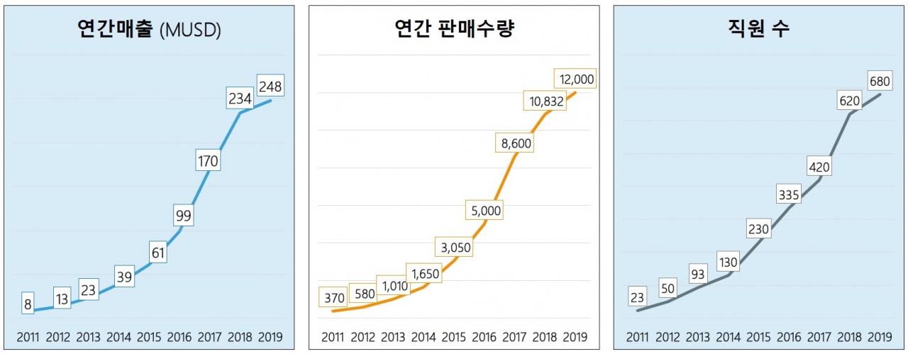 2005년 덴마크에서 3명이 창립한 이래, 매년 수십 % 이상 성장해온 회사다. 현재는 전 세계 20개국에서 680명 이상의 임직원이 활동하고 있다. 2019년에는 전 세계 판매량 1만 2000대를 기록했으며, 2019년 4분기까지 전 세계 누적 판매량은 4만 2000대를 넘어섰다.