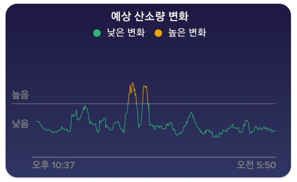 예상 산소량 변화는 혈중 산소 포화도의 변화를 대략적으로 계산해 보여준다. 산소 포화도는 피부와 혈관에 빨간색 적외선 빛을 비추는 센서로 측정하며, 해당 센서를 탑재한 스마트워치 버사(Versa) 시리즈, 아이오닉(Ionic), 피트니스 트래커 차지3(Charge 3)는 수면 중 사용자의 혈중 산소 포화도를 측정하는 기능을 새롭게 제공한다.