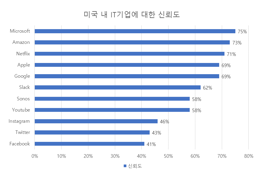 반면, 구글, 아마존, 마이크로스프트, 넷플릭스, 유튜브는 전반적으로 사회에 긍정적인 영향을 미치고 있다는 의견이 대부분이었다. 미국시민 중 75%가 마이크로소프트는 신뢰하고 있으며, 아마존에 대한 신뢰도는 73%인 것으로 나타났다. 페이스북에 대한 신뢰도는 41%로, 절반이 채 되지 않았다.
