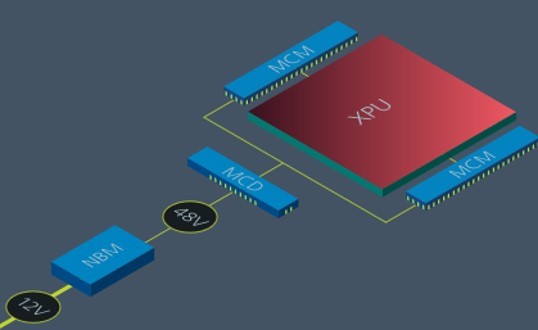 엔비디아(NVidia)의 SXM, OCP(Open Compute Project)의 OAM 카드와 같은 새로 등장한 대부분의 AI 가속기 카드는 AI 프로세서의 500~700W에 이르는 전력 레벨로 인해 48V 입력으로 설계된다. 여전히 12V PDN 백플레인을 랙에 사용하는 서버 업체들은 클라우드 컴퓨팅에 이런 고성능 카드를 적용하기 위해 12V에서 48V로 변환해야 한다. 양방향 K=1/4 비절연 고정비율 컨버터를 12~48V 변환 부스트 컨버터(K=1/4)로 이런 가속기 카드나 분산형 고전력 12~48V 모듈에 추가하면, 기존의 랙 시스템에 매우 쉽게 설치할 수 있고, AI 성능과 용량을 확보할 수 있다.
