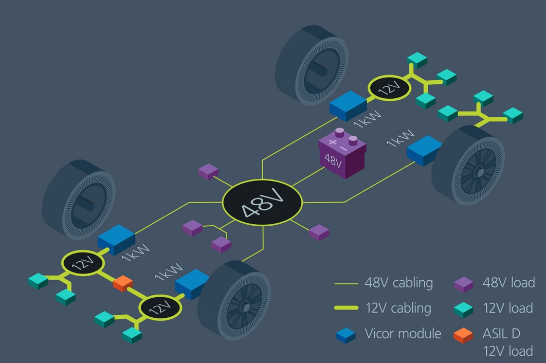 48V는 SELV를 준수하고, 최신 PoL 12V 레귤레이터는 입력 전압의 변동을 처리할 수 있어 48V-12V DC-DC 변환 스테이지에는 비절연 고정비율 컨버터가 적합하다. 비절연, 비레귤레이션 고정비율 컨버터는 전력 소모가 낮고, 전력 밀도가 높으며, 비용이 저렴한 가장 효율적인 고전력 버스 컨버터다. 높은 전력밀도로 비절연 고정비율 컨버터를 부하 근처에 배치할 수 있어 하이브리드 자동차에 새로운 분산형 전력 분배 아키텍처를 구현할 수 있다. 이를 통해 더욱 효율적인 48V PDN을 실행할 수 있는 것이다. 서버 블레이드의 경우, 소형 비절연 48V-12V 변환 고정비율 컨버터를 벅 레귤레이터와 가까이 마더보드에 배치할 수 있다.