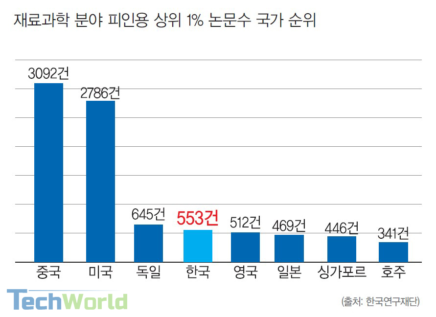 한국연구재단에 의하면, 재료과학 분야의 피인용 상위 1% 논문수 국가순위(2007~2017년)에서 중국, 미국, 독일에 이어 한국이 논문 수 553개로 4위를 기록하고 있다. 피인용 상위 1%란 해당 논문이 다른 논문에 인용된 횟수가 상위 1%에 포함되는 논문을 의미한다. 소재 분야에서 강세를 보이는 일본은 6위에 그쳐있다. 한국은 다른 연구 분야에 비해 국내에서 강세를 보이고 있어 연구경쟁력은 뛰어나다는 것을 알 수 있다. 이에 기초과학연구원(IBS)은 당장은 산업 현장에서의 기술력이 뒤처질 수 있으나, 10~20년 뒤 중장기적인 미래에는 더 우세할 것으로 기대된다”고 밝힌 바 있다.