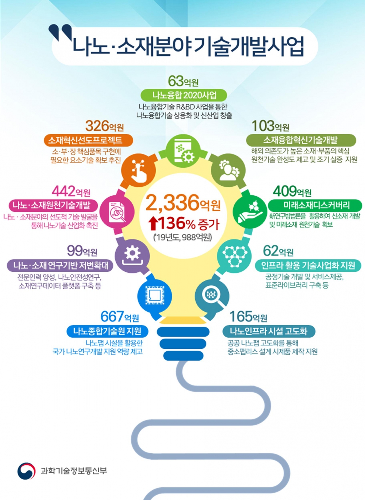 작년 12월, 과학기술정보통신부(이하 과기정통부)는 2020년 나노·소재분야 기술개발사업 시행계획을 발표하면서, 현재 경쟁력 확보가 시급한 전략 소재·부품의 중점 요소 기술 개발을 우선 지원할 것을 발표했다. 이후로도 중장기적인 관점에서 미래소재·부품, 첨단 연구·검사장비 등에 선제적 투자를 병행할 것이라고 밝혔다. 사업 계획에 따르면 나노·소재원천기술 개발에는 올해 442억 원, 신소재를 개발하는 미래소재디스커버리 사업에는 409억 원의 예산이 책정됐으며, 전체 개발 사업에 총 2336억 원이 투입된다.