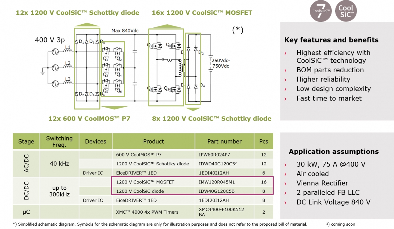 효율, 신뢰성, 열 문제, 크기, 비용 등 모든 부분을 고려했을 때, SiC 디바이스가 적합한 솔루션이라는 것을 알 수 있다. 기존의 실리콘 MOSFET 스위치를 결합하거나, 적은 부품으로 최대 효율을 내기 위해 SiC 스위치를 결합할 수 있으며, 이에 적합한 게이트 드라이버와 제어 장치를 결합해 공기 냉각으로 30kW나 그 이상의 모듈이 세계 각 지역의 충전 표준을 충족하도록 만들 수 있다.