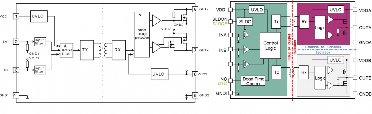 여기서 논의되는 디자인들은 EiceDRIVER 제품 라인 중 1ED와 2Edi, 2개의 제품군을 사용하고 있다. 이런 디자인의 단일 채널 절연형 CT 게이트 드라이버인 1EDCx0I12AH는 광폭 바디 패키지로 제공되며, UL-1577 인증을 취득하고 있다. 입력 측으로 넓은 전압 범위를 지원해 MCU나 DSP로 간편하게 연결할 수 있으며, 출력 측으로 유니폴라와 바이폴라 동작을 둘 다 지원한다. 레일-투-레일 출력 드라이버로서 게이트 저항 선택을 간편하게 만들고, 외부적인 고전류 바이패스 다이오드를 요구하지 않는다. 또한, 상·하측 구성이 dv/dt 제어를 향상시킨다[그림 4].