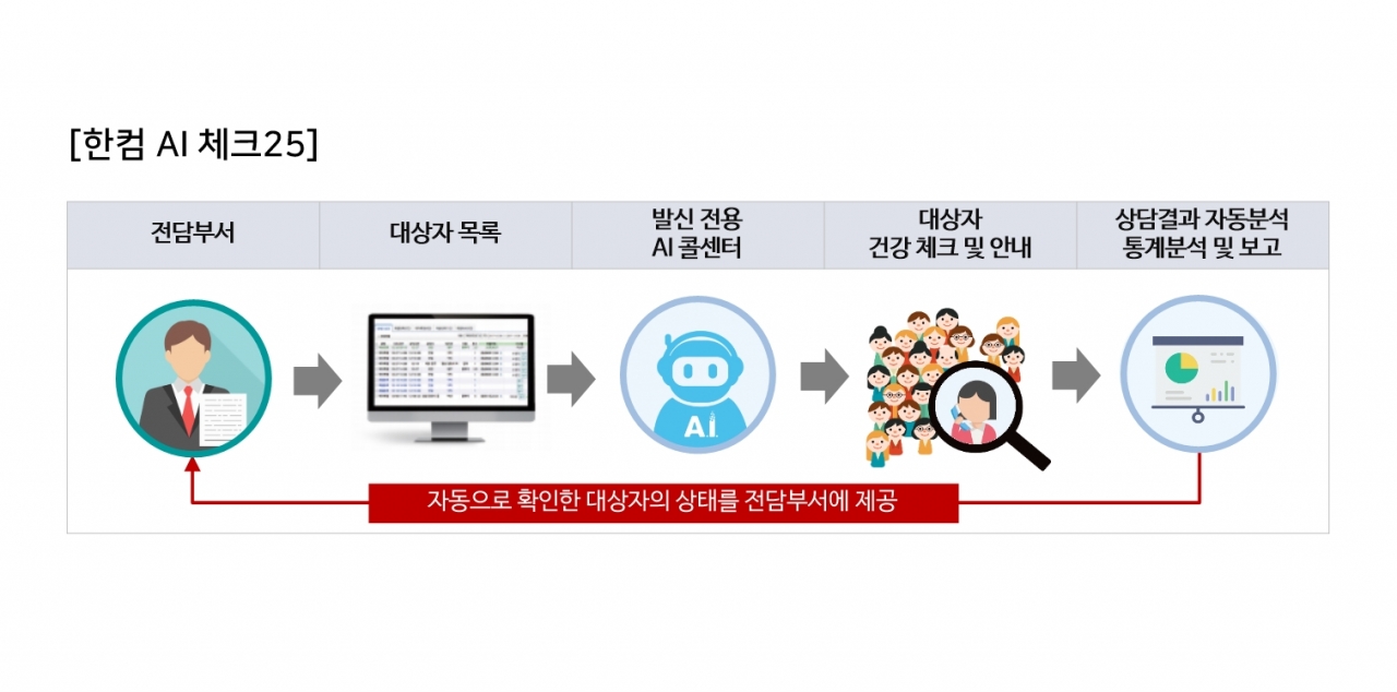 ’한컴 AI 체크25‘는 능동 감시자와 자가 격리자의 발열, 체온, 기침 등 건강 상태를 체크할 수 있는 아웃바운드콜 시스템이다. 대상자의 답변을 즉시 데이터화하고, 데이터 통계와 분석 결과를 즉시 확인할 수 있다.