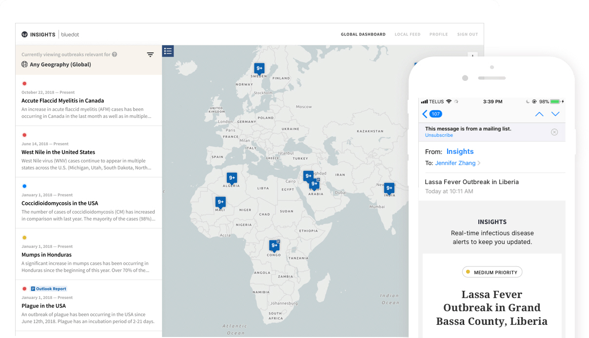 올해 코로나19 발발을 세계보건기구(WHO)보다 열흘 앞서 경고한 것은 캐나다의 AI 기반 건강 모니터링 플랫폼 블루닷(BlueDot)이다. 블루닷은 각종 질병 네트워크나 언론 보도 등의 데이터를 수집·분석해 특정 질병이 발발하거나 유행할 가능성, 위험 지역 등을 사전에 판단해 경고해주는 서비스다.