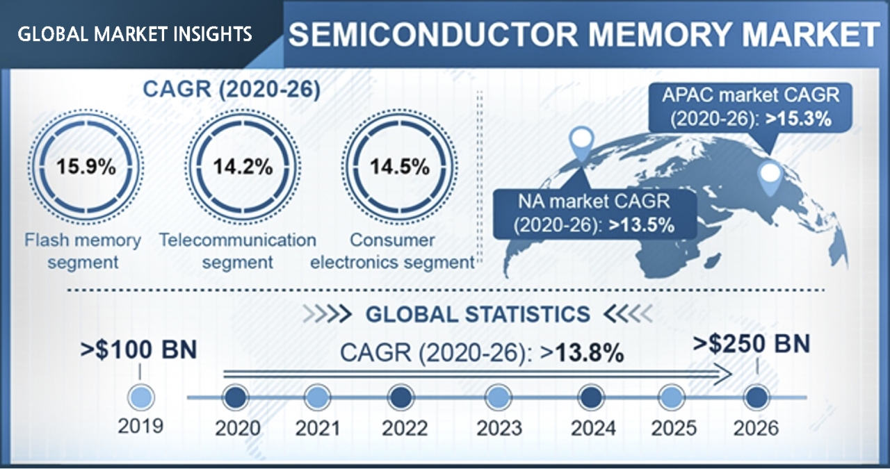 글로벌 마켓 인사이트(Global Market Insight)에 따르면, 메모리 반도체 시장규모는 2019년 1000억 달러(약 125조 원)를 넘어섰고, 2026년에는 2500억 달러(약 317조 원)에 이를 것으로 보인다. 2020년부터 2026년까지 연평균성장률(CAGR)은 13.8%으로 전망된다. 세계적으로 스마트 기기와 스마트폰에 대한 수요가 증가함에 따라 시장이 확장할 것으로 보이기 때문이다.