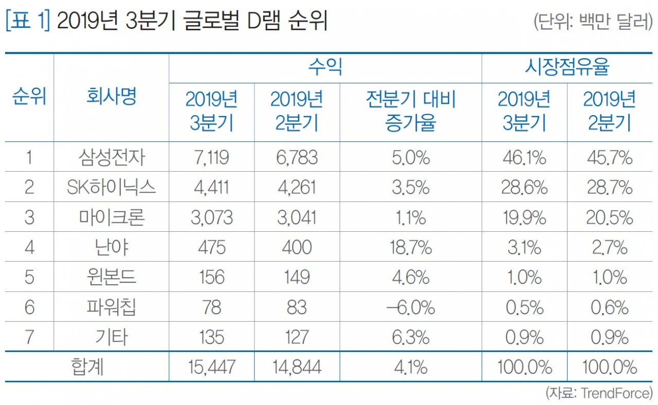 삼성전자는 세계 D램 시장점유율에서 꾸준히 1위 자리를 유지하고 있다. 트렌드포스(TendForce)에 따르면, 2019년 3분기 삼성전자는 46.1%의 시장점유율로 1위를 차지했으며, SK하이닉스가 28.6%, 마이크론(미국)이 19.9%로 뒤를 이었다. 세 업체의 시장점유율이 94.6%로 대부분을 차지했으며, 한국 업체만 따져도 74.7%에 이른다.