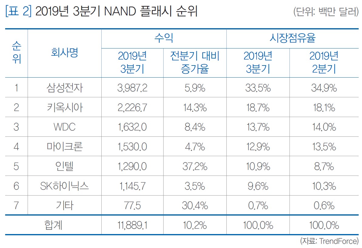 NAND 플래시 부문에서는 삼성전자가 2019년 3분기 33.5%로 1위를 유지했으며, 그 뒤를 이어 키옥시아(일본, 전 도시바메모리)가 18.7%, WDC(미국)가 14.7%, 마이크론(미국)이 11.3%, 인텔이 9.7%, SK하이닉스가 9.6%를 차지했다. 국가별로는 한국은 삼성전자와 SK하이닉스를 합쳐 43.1%로 1위, 미국은 WDC, 마이크론, 인텔을 합쳐 35.7%로 2위, 일본은 키옥시아가 18.7%로 2위를 유지하고 있다. 하지만 한국 반도체 업체의 2019년 3분기 시장점유율은 그해 2분기 45.2%보다 2.1%p 낮아져 안심할 수 없는 상황이다.