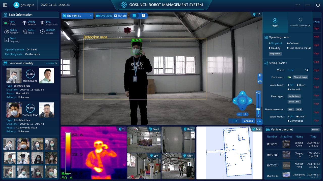 만약 체온이 고온으로 확인되거나 마스크 부재가 감지될 경우 로봇이 바로 관련 기관에 경고를 보내고 실시간 상황 대응과 의사 결정을 위해 필요한 데이터를 중앙 제어센터로 전송한다. 해당 로봇은 자율주행과 원격제어 기능을 겸하고 있으며, 광저우, 상하이, 시안, 구이양 도시의 공항과 쇼핑몰에서 근무 중이다.