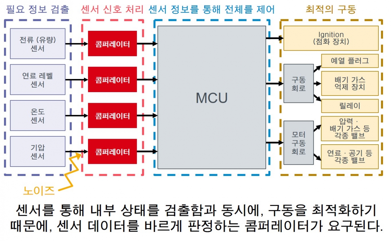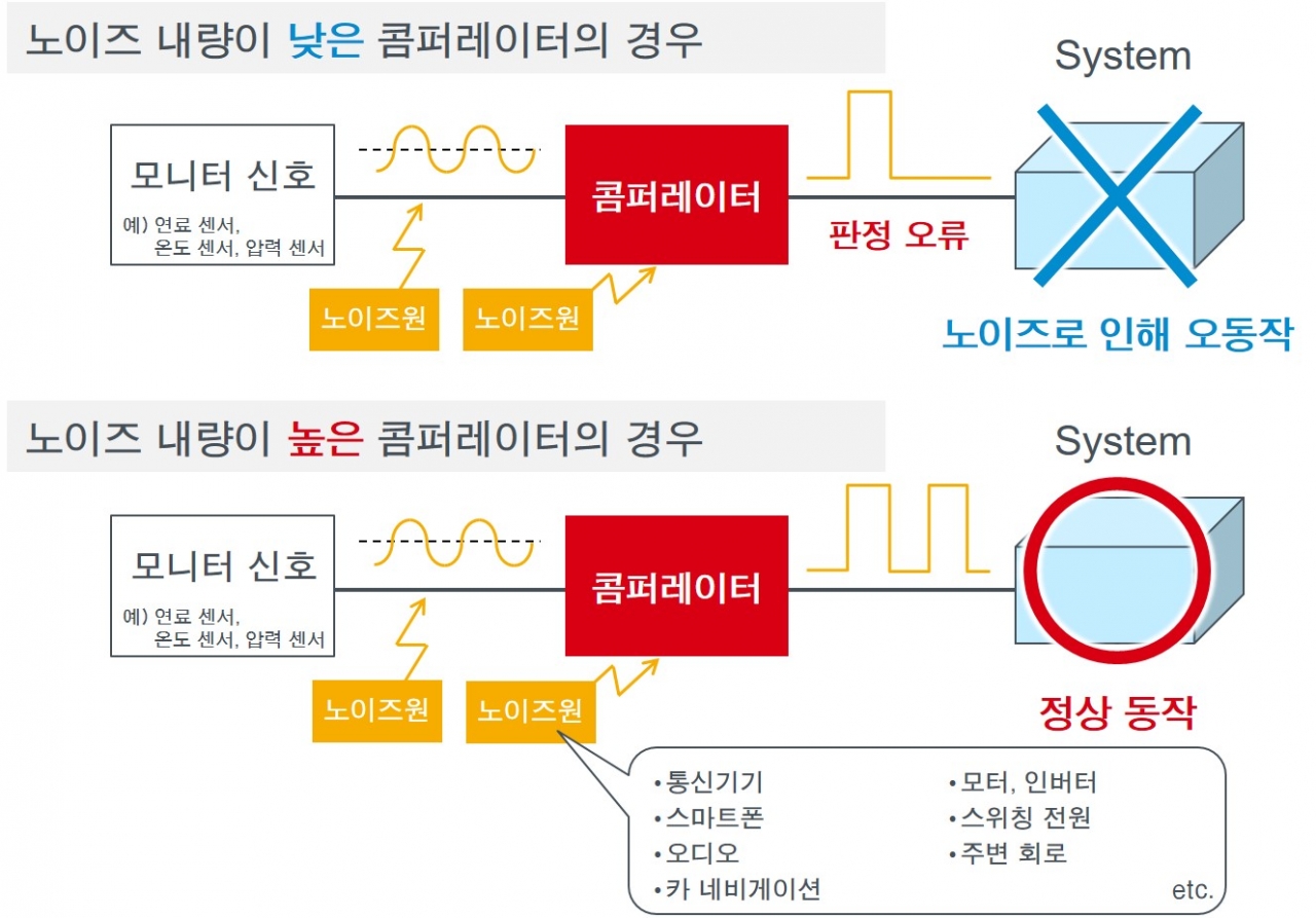 그 결과 MCU의 인식 오류 또는 오동작을 일으켜, 시스템의 오동작을 초래한다. 반면에 콤퍼레이터의 노이즈 내량이 높으면 노이즈를 제거함으로써 센서 신호를 정확하게 판정해 MCU로 출력할 수 있으므로 시스템을 정상적으로 동작시킬 수 있다. 따라서, 전자부품의 고집적화가 진행되는 ECU와 인버터에 있어서는 노이즈 내량이 높은 전자부품이 필요하다.