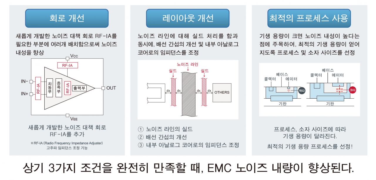 앞서 기술한 바와 같이, 로옴은 이 시리즈의 제1탄으로서 2017년에 자동차의 파워 트레인과 엔진 컨트롤 유닛 등 가혹한 환경에서 차량용 센서를 채용하는 자동차 전장 시스템에 최적인 그라운드 센스 OP Amp를 개발했다. 또한 이 기술을 콤퍼레이터에 전개해 높은 노이즈 내량의 콤퍼레이터 ‘BA8290xYxx-C 시리즈’를 개발했다. 본 시리즈의 OP Amp·콤퍼레이터는 노이즈 내량을 개선하기 위해 넓은 주파수 대역에서 노이즈를 차단할 수 있는 EMI 필터 회로를 내장하고, 전원 라인, 그라운드 라인, 소자 배치 등을 전면적으로 개선했다. 노이즈에 강한 칩 레이아웃으로 변경하고, 노이즈에 더욱 강한 독자적인 바이폴라 프로세스를 채용했다[그림 5].